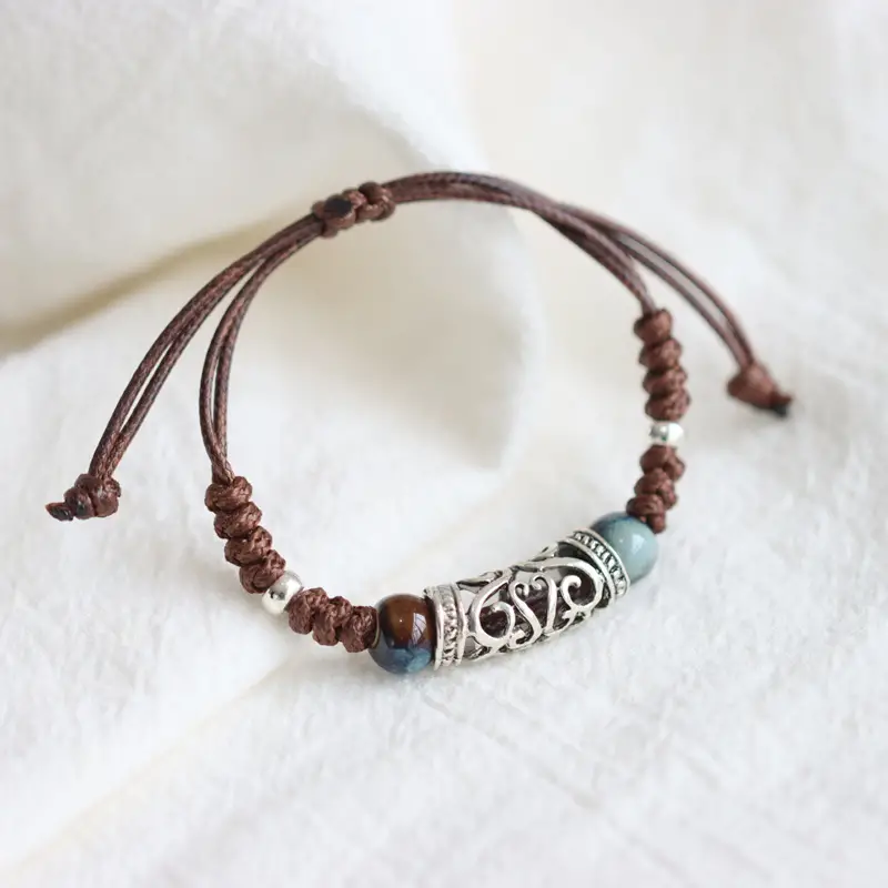 Stylish rope/string bracelet with metal design and beads. Easy to adjust.